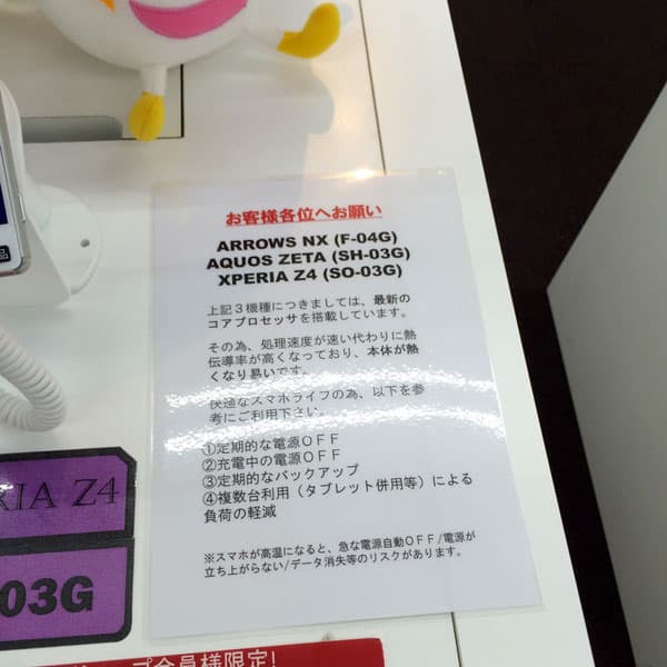 О том, что проблема существует, свидетельствуют предупреждения, которыми некоторые японские магазины сопровождают смартфоны на однокристальной системе Qualcomm Snapdragon 810. В них сказано, что смартфоны склонны к перегреву, поэтому их рекомендуется периодически выключать, в том числе, во время зарядки, и регулярно делать резервные копии данных.