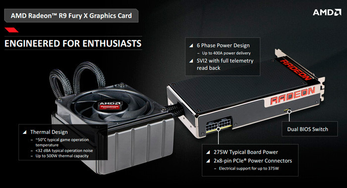Карта оснащена системой жидкостного охлаждения, что делает ее «холодной и тихой». По данным AMD, в играх температура GPU будет примерно равна 50°C, а уровень шума не превысит 32 дБ. Источник приводит соответствующие данные для Nvidia GeForce GTX Titan X: температура — 84°C, уровень шума — 45 дБ.
