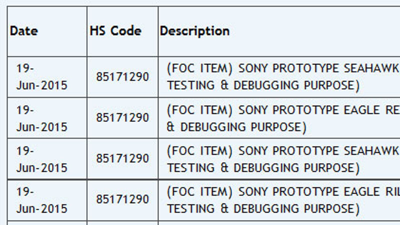 В базе данных портала Zauba обнаружены записи о том, что несколько дней назад в Индию были ввезены прототипы четырех новых смартфонов Sony. Список включает модели Seahawk Rex PQ, Eagle Rex AP, Seahawk Gina AP и Eagle Rilads AP. Все они были импортированы 19 июня. Цель ввоза — тестирование и отладка.
