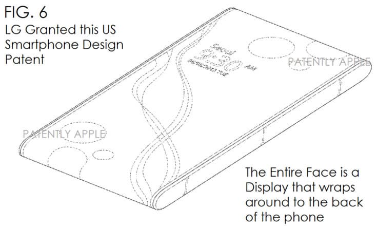 Компания LG получила в США патент на конструкцию смартфона, в которой экран загнут за два края корпуса, как показано на иллюстрациях.