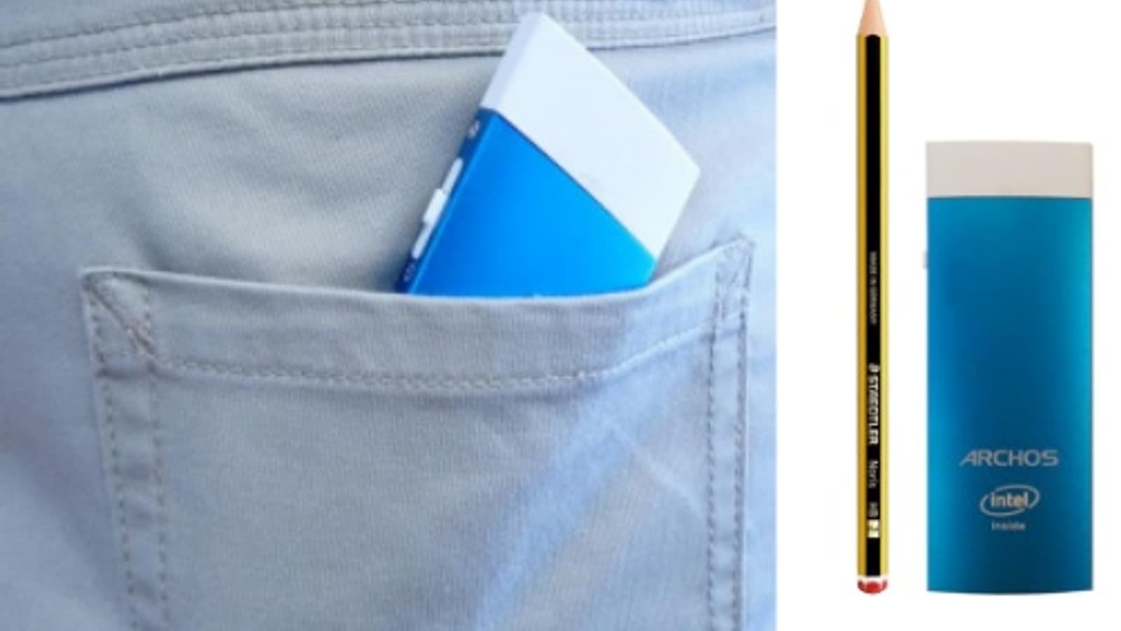 Стоит отметить достаточно компактные размеры (113 х 37,6 х 14 мм) и синюю расцветку, благодаря которой устройство выделяется среди себе подобных. В качестве ОС выступает Windows 10. В продаже ПК появится сразу после выхода системы Microsoft.