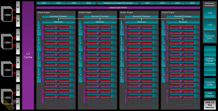 Если верить первым слухам, графический процессор R9 Fury получит 3584 активных потоковых процессора. Частоты ядра и памяти будут идентичны старшему решению. Источник говорит о том, что температура GPU не будет превышать 75°С с референсной СО.