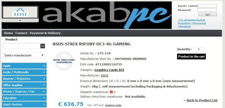 Судя по публикации источника, 3D-карта Asus Radeon R9 Fury Strix будет оснащена охладителем DirectCU III. Упоминание о ней уже появилось в некоторых онлайновых магазинах.