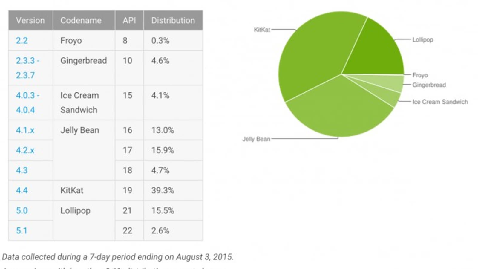 Любопытно, что доля версии KitKat не только не уменьшилась, она даже увеличилась, пусть и очень незначительно (с 39,2% до 39,3%). Далее видно, что это произошло за счёт более старых версий поколения Jelly Bean, доля которых снизилась с 37,4% до 33,6%.