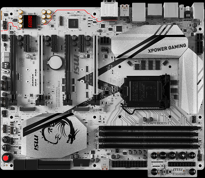 Плата MSI Z170A XPower Gaming Titanium Edition располагает четырьмя слотами для ОЗУ суммарным объемом до 64 ГБ. Слоты расширения насчитывают четыре PCI-E 3.0 x 16 и три PCI-E 3.0 x 1. Есть два порта SATA Express, восемь SATA 6 Гбит/с, два M.2. На монтажную планку выведены шесть портов USB 3.1 и три USB 2.0, два видеовыхода HDMI и один DisplayPort, аналоговые аудиовыходы в конфигурации 7.1 и оптический S/PDIF.Порт сетевого контроллера Intel i219 защищен от перенапряжений до 15 кВ. Аудиотракт состоит из кодека Realtek ALC1150, двух операционных усилителей TI OPA1652 для выхода на наушники и электролитических конденсаторов Nippon Chemi-Con. Колодки для подключения фронтальных разъемов USB 3.1 подключены к повторителям ASMedia ASM1464, что улучшает работу при использовании длинных кабелей в больших корпусах. Система питания основана на PWM-контроллере Intersil ISL6388, дочерняя плата Direct OC позволяет быстро менять множитель и базовую частоту. Также в этой плате дебютировали «титановые» катушки, сохраняющие работоспособность при температурах до 220°С.