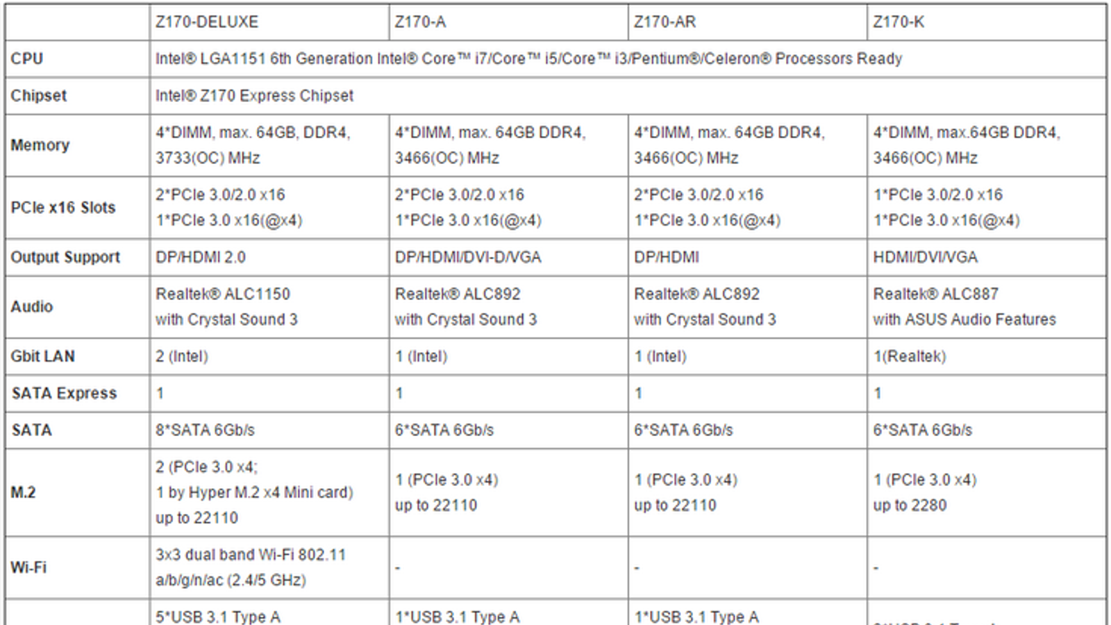 Вместе со всеми обновила свой ассортимент системных плат и компания Asus. Естественно, речь идёт о моделях на наборе логики Intel Z170 для процессоров Skylake. Asus поделила все новинки на две линейки. Большая из них — Z170 Signature Series. Она включает в себя восемь плат: Z170-Deluxe, Z170-A, Z170-AR, Z170-K, Z170-P, Z170-P D3, Z170M-Plus и Z170M-E D3.