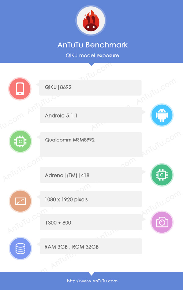 Относительно недавно китайская компания-разработчик антивирусного ПО Qihoo 360 и Coolpad, один из крупнейших производителей смартфонов в Поднебесной, сообщили о создании совместного предприятия по производству мобильных устройств под маркой QiKU. И вот сейчас в базе данных AnTuTu обнаружилась запись, которая, судя по названию, как раз и относится к первому смартфону QiKU.