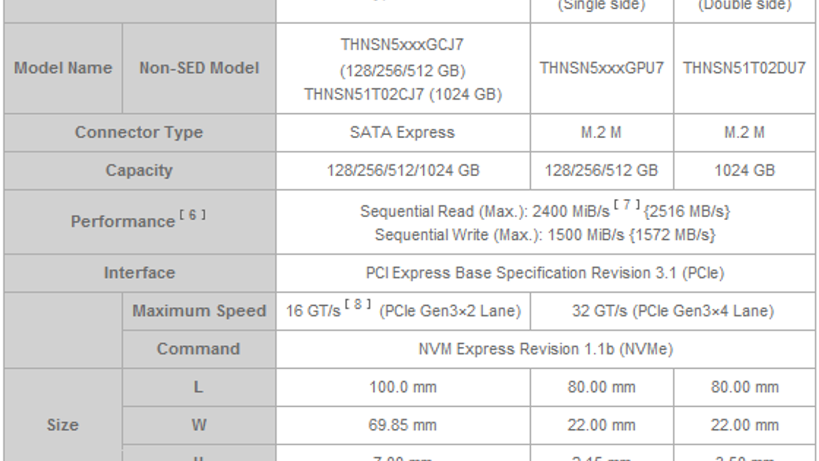 В серию для мощных ноутбуков Toshiba XG3 входят односторонние модели M.2 2280 (объем 128, 256 и 512 ГБ), двухсторонние M.2 2280 (1024 ГБ) и SSD типоразмера 2,5 дюйма высотой 7 мм с интерфейсом SATA Express (128, 256, 512 и 1024 ГБ).