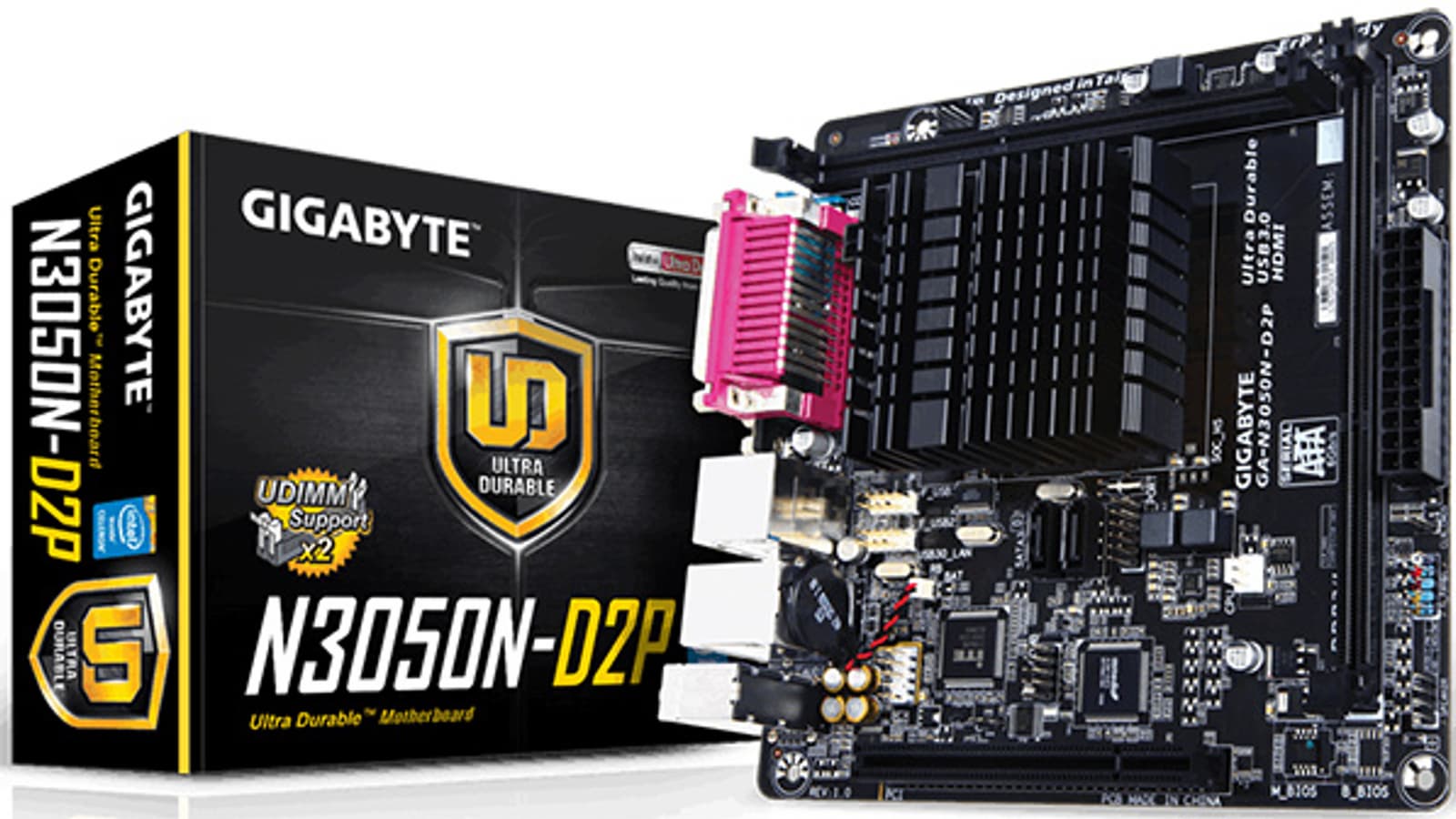 Очень интересно выглядит интерфейсная панель Gigabyte GA-N3050N-D2P — наличие на ней портов LPT и COM говорит о совместимости изделия со специализированным оборудованием, а за счет разъема D-Sub обеспечивается подключение к далеко не самым современным мониторам. При всем при этом сохраняется совместимость с современными накопителями (за счет четырех портов USB 3.0) и дисплеями (HDMI).