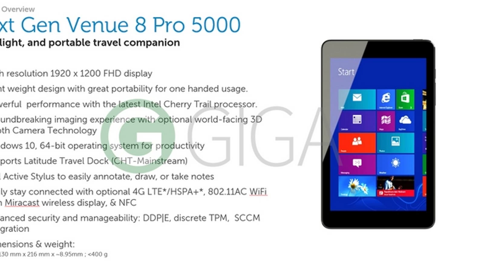 Работать аппарат, само собой, будет под управлением Windows 10. Также стоит отметить наличие разъёма USB-C (USB Type-C) и модуля NFC. Из дополнительных опций можно выделить док-станцию Latitude Travel Dock и модем LTE. Габариты планшета составят 130 х 216 х 8,95 мм при массе менее 400 г.