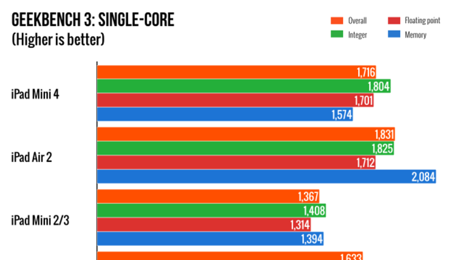 Во-первых, платформа A8 в планшете работает на частоте 1,5 ГГц, тогда как у прошлого поколения смартфонов частота SoC составляет 1,4 ГГц. Второй нюанс — iPad mini 4 располагает 2 ГБ оперативной памяти, как и Air 2, тогда как у предыдущих малышей памяти вдвое меньше.