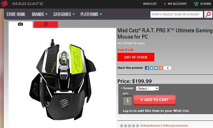 В августе компания Mad Catz анонсировала мышь Mad Catz R.A.T. Pro X со сменным датчиком. Тогда производитель не стал называть цену новинки, но пообещал, что поставки начнутся в октябре. На этой неделе планы Mad Catz воплотились в жизнь: мышь появилась в ассортименте онлайнового магазина компании. Хотя пока устройства нет в наличии, указана его цена. Она равна $200.