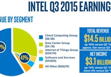 Выручка Intel в третьем квартале 2015 года составила 14,5 млрд долларов, чистая прибыль — 3,1 млрд долларов