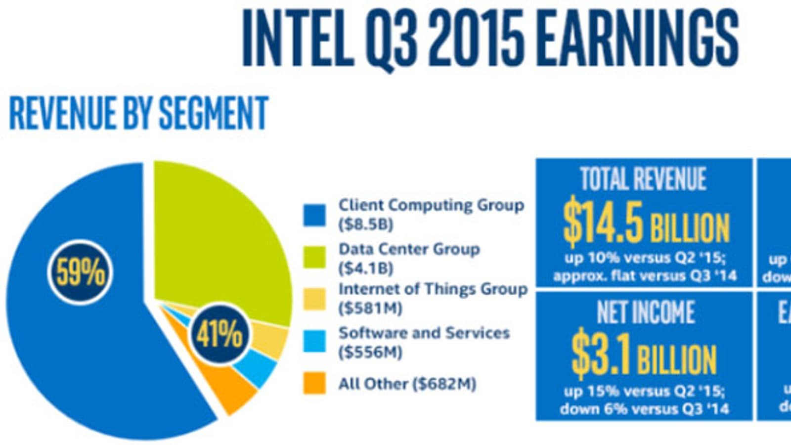 Компания Intel опубликовала отчет за третий квартал 2015 года. Согласно содержащимся в отчете данным, выручка компании за указанный период составила 14,5 млрд долларов, что несколько выше среднего значения интервала, который прогнозировал производитель. Валовая прибыль в размере 63% соответствует прогнозу.