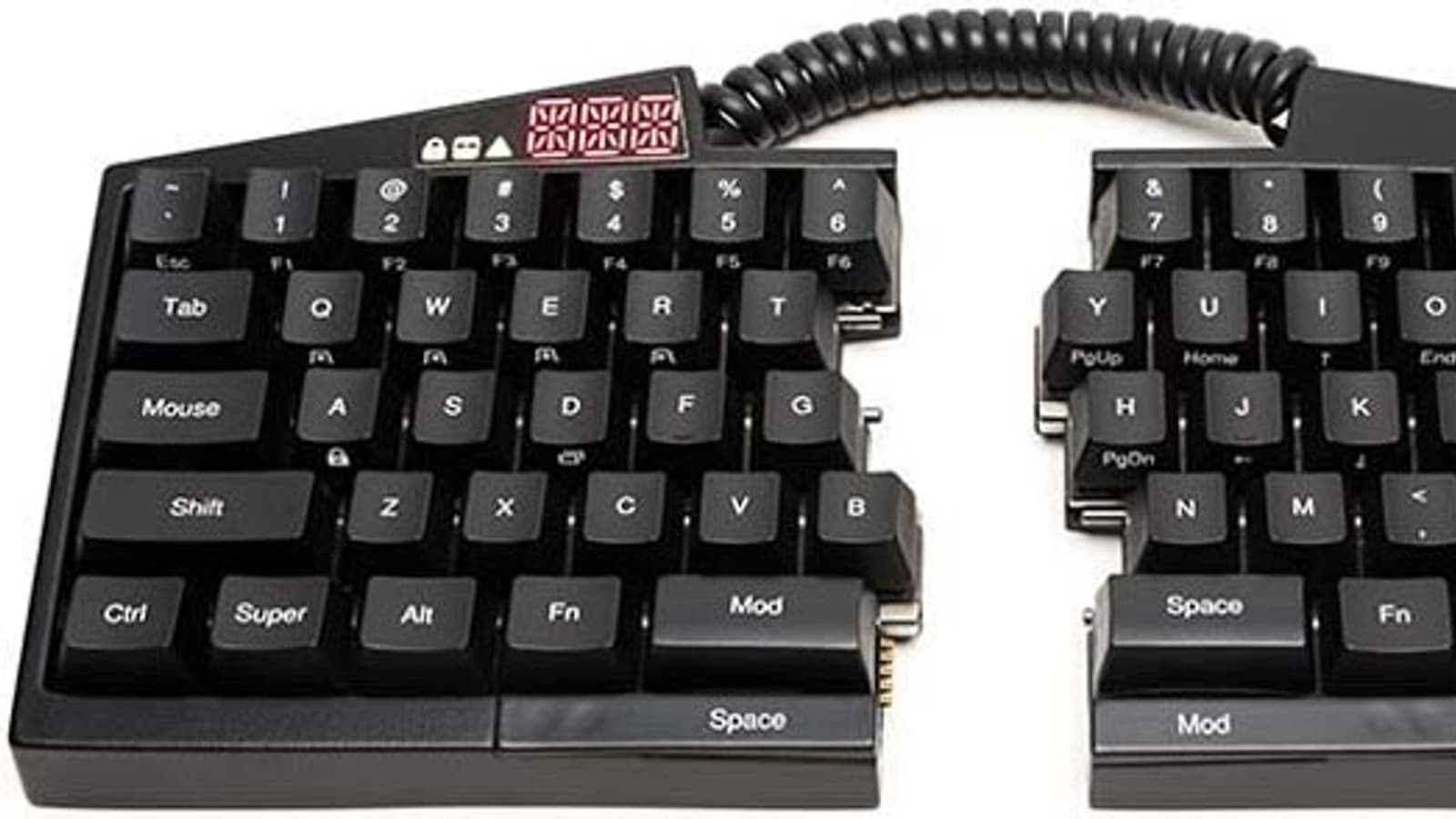 Клавиатура разделена на два блока, которые можно размещать под углом друг к другу, за счет чего кисти принимают более удобное положение. Отсутствие навигационного и цифрового блока ускоряет перенос кисти правой руки с клавиатуры на мышь обратно.