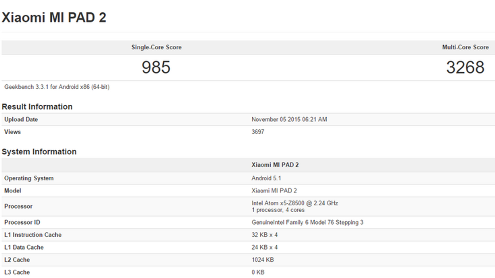 Несколько дней назад в базе данных Geekbench появились результаты теста планшета Xiaomi Mi Pad 2. И действительно, в основе лежит процессор Intel Atom x5-Z8500. Конечно, это ещё не является достаточным доказательством, что именно таким будет устройство китайского гиганта, но теперь хотя бы у слухов появилось более веское доказательство.