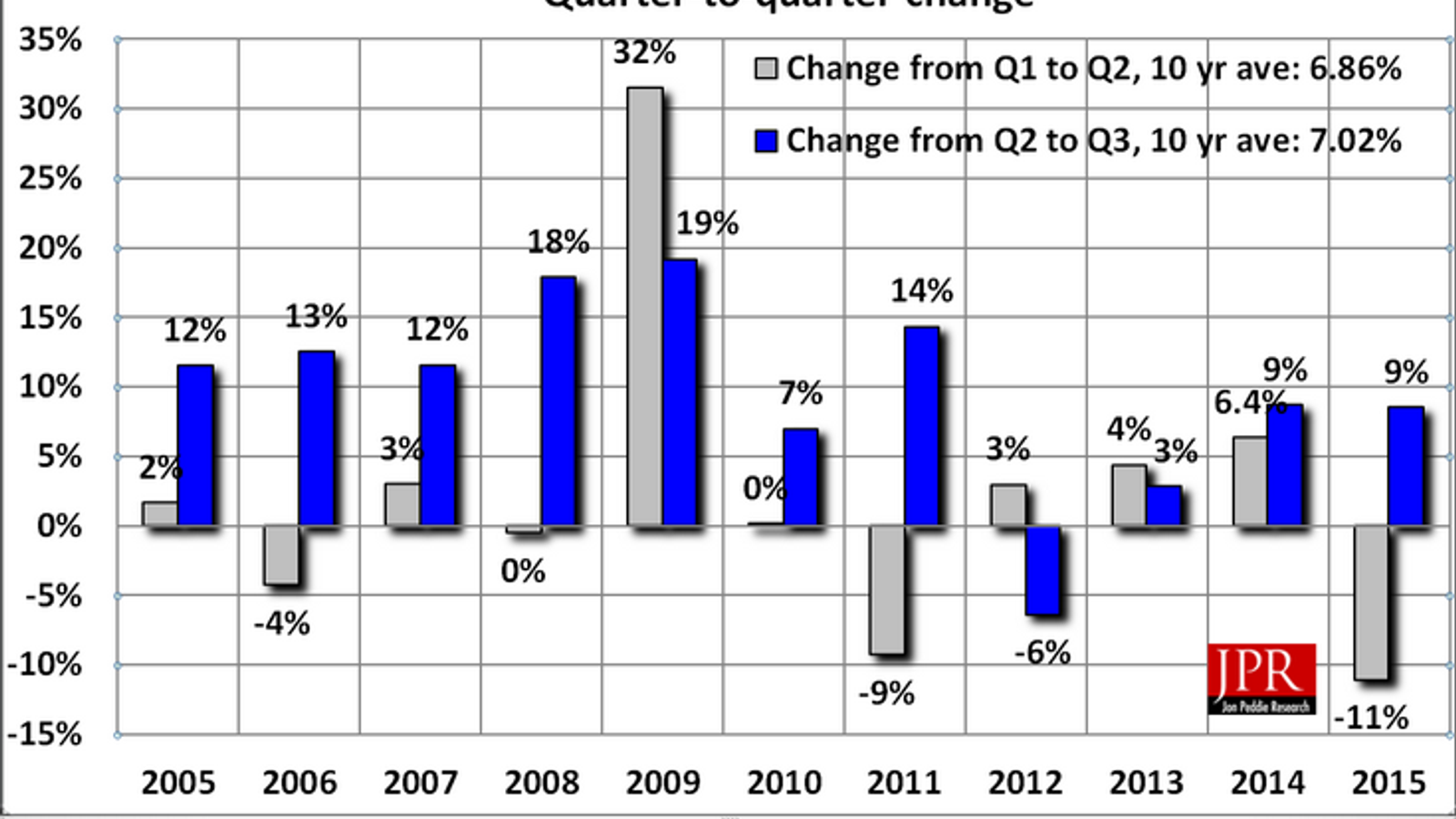Согласно данным аналитиков Jon Peddie Reseach, поставки GPU в третьем квартале текущего года увеличились по сравнению с предыдущим на 9%. В годовом выражении зафиксирован спад на 19%.