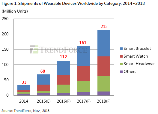 Аналитики TrendForce решили оценить рынок носимой электроники. Суммарные поставки таких устройств по итогам текущего года, как считает источник, составят 68,1 млн единиц, а в 2016 году вырастут ещё на 64%.