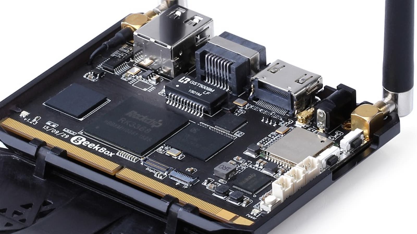 Система GeekBuying GeekBox основана на восьмиядерной 64-разрядной SoC Rockchip RK3368, успевшей засветиться в других медиацентрах. Установлено ОЗУ LPDDR3-1600 объемом 2 ГБ и флэш-накопитель eMMC 5.0 производства Samsung с потоковой скоростью чтения и записи до 250 и 90 МБ/с (до 7000 IOPS). Беспроводной адаптер AmPak AP6354 поддерживает связь в сетях Wi-Fi 802.11n/ac по схеме 2:2 и Bluetooth 4.1. Поддерживается декодирование 10-битного видео в формате H.265 и разрешении 4K с частотой до 60 к/с и его вывод посредством порта HDMI 2.0. Также на основной плате есть порт Gigabit Ethernet, два USB 2.0, один MicroUSB с поддержкой OTG, один слот для карт microSD, две коннектора для съемных антенн и вход для комплектного внешнего адаптера питания. На плате распаян трехконтактный UART и интерфейсы eDP для дисплея и сенсорной панели, двухконтактная колодка для вентилятора и кнопки включения, прошивки и перезагрузки.