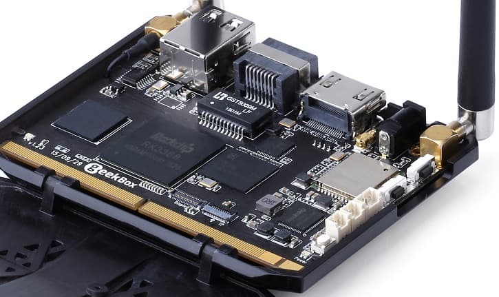 Система GeekBuying GeekBox основана на восьмиядерной 64-разрядной SoC Rockchip RK3368, успевшей засветиться в других медиацентрах. Установлено ОЗУ LPDDR3-1600 объемом 2 ГБ и флэш-накопитель eMMC 5.0 производства Samsung с потоковой скоростью чтения и записи до 250 и 90 МБ/с (до 7000 IOPS). Беспроводной адаптер AmPak AP6354 поддерживает связь в сетях Wi-Fi 802.11n/ac по схеме 2:2 и Bluetooth 4.1. Поддерживается декодирование 10-битного видео в формате H.265 и разрешении 4K с частотой до 60 к/с и его вывод посредством порта HDMI 2.0. Также на основной плате есть порт Gigabit Ethernet, два USB 2.0, один MicroUSB с поддержкой OTG, один слот для карт microSD, две коннектора для съемных антенн и вход для комплектного внешнего адаптера питания. На плате распаян трехконтактный UART и интерфейсы eDP для дисплея и сенсорной панели, двухконтактная колодка для вентилятора и кнопки включения, прошивки и перезагрузки.