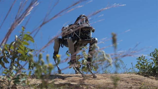 Четырехногий робот Spot, который является более совершенной версией BigDog, позволяет двигаться тише и перемещаться по сложным типам поверхности, что делает его более эффективным при решении различных задач. Недавно испытания Spot начал Корпус морской пехоты США (The United States Marine Corps). Военные проверяют возможности робота при перемещении не только по асфальту, но и по пересеченной местности, в лесу, а также в узких проулках различных поселений. Управляется робот дистанционно на расстоянии до 500 м при помощи ноутбука и игрового контроллера, причем с системой управления, по заверению источника, справится даже ребенок.