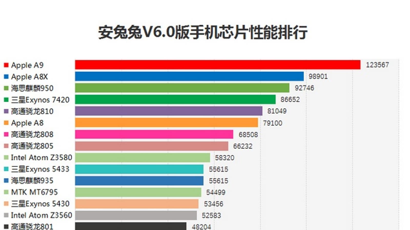 А результаты таковы, что на первом месте с пока ещё непривычно огромным результатом в 123 567 баллов разместилась SoC Apple A9, установленная в новом поколении смартфонов купертинской компании. К сожалению, в таблице нет результатов A9X, которая явно будет ещё быстрее.