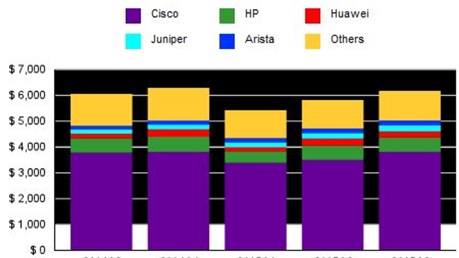 Специалисты IDC в очередной раз подвели итоги квартала на рынке коммутаторов Ethernet (Layer 2/3). По подсчетам аналитиков в третьем квартале 2015 года объем указанного рынка в денежном выражении составил 6,1 млрд долларов. Это на 6,1% больше, чем в предшествующем квартале, и на 2% больше показателя за третий квартал 2014. Интересно, что рынок маршрутизаторов корпоративного уровня по сравнению с предшествующим кварталом сократился на 7,2%. По сравнению с третьим кварталом 2014 года объем продаж практически не изменился.