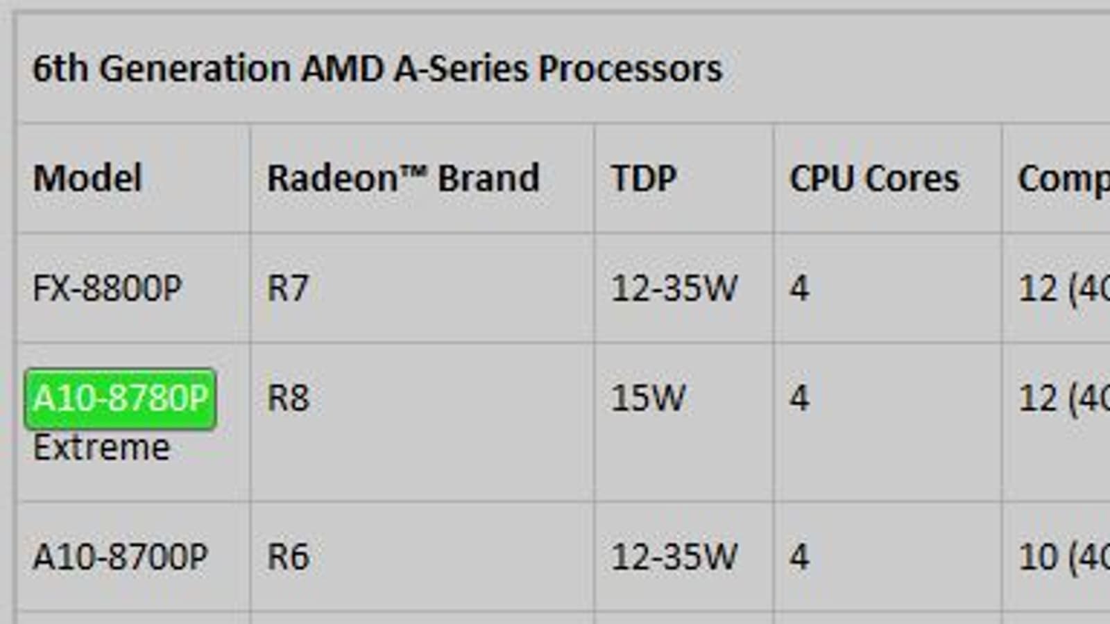 Графический процессор A10-8780P Extreme включает восемь вычислительных ядер (512 потоковых процессоров Radeon). Производитель обозначает его как Radeon R8, из чего можно сделать предположение о превосходстве по производительности над GPU процессора FX-8800P (Radeon R7). Для подтверждения этого предположения не хватает данных о частоте, на которой работает GPU. Значение TDP APU A10-8780P Extreme указано равным 15 Вт.