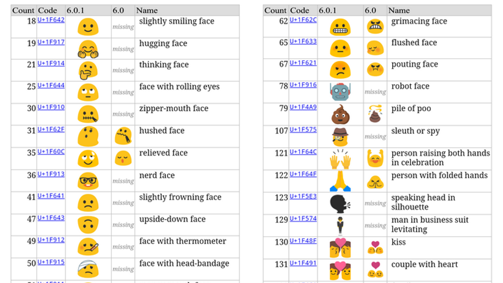 Вчера смартфоны Nexus начали получать обновление ОС Android 6.0.1. Нововведений немного. Среди них числятся новые и обновлённые смайлы emoji. Таблицу со всеми жёлтыми рожицами можно посмотреть по ссылке у источника.