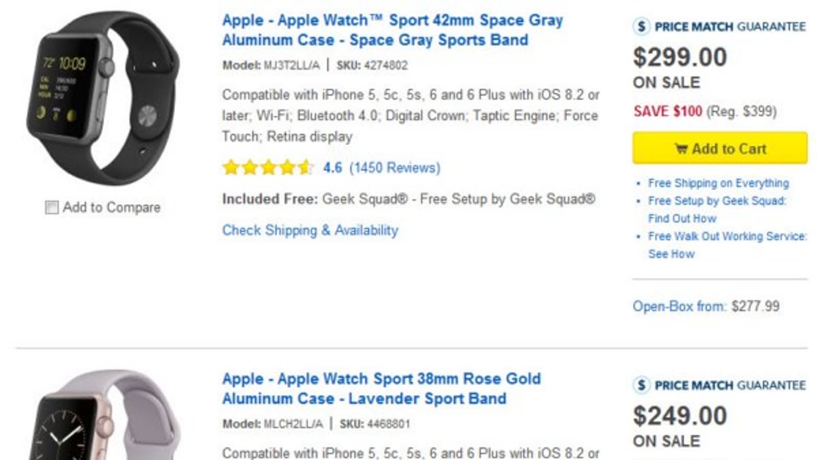 В ходе «Черной пятницы» Best Buy уже снижала цену на Apple Watch на $100, однако на тот момент скидка действовала только на старшие модели. Для более доступных Apple Watch Sport снижение цены было не таким существенным. В данный момент все модели Apple Watch в Best Buy подешевели на $100. Apple Watch Sport с корпусом размером 38 мм предлагаются за $250, модель размером 42 мм стоит $300, более дорогие модификации с различными вариантами ремешков также подешевели на $100.