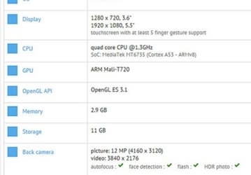 Смартфон получил дисплей IPS диагональю 5,5" с разрешением 1280 х 720 пикселей и четырехъядерный процессор от Mediatek, который работает на частоте 1,3 ГГц