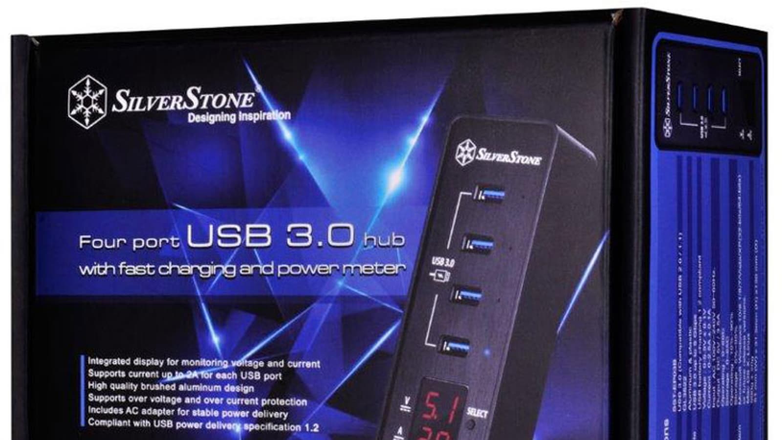 Концентратор SilverStone EP03 имеет четыре порта USB 3.0 и цифровой индикатор напряжения и силы тока, позволяющий просматривать текущие значения этих параметров для каждого порта.