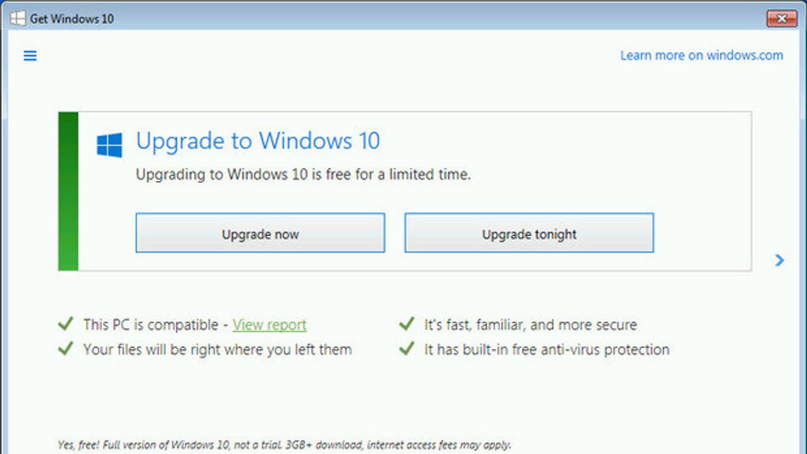 Как стало известно, после очередного обновления Microsoft стала еще более настойчивой. В окошке Get Windows 10 у пользователей теперь есть два варианта: «Обновиться сейчас» или «Обновиться сегодня ночью».