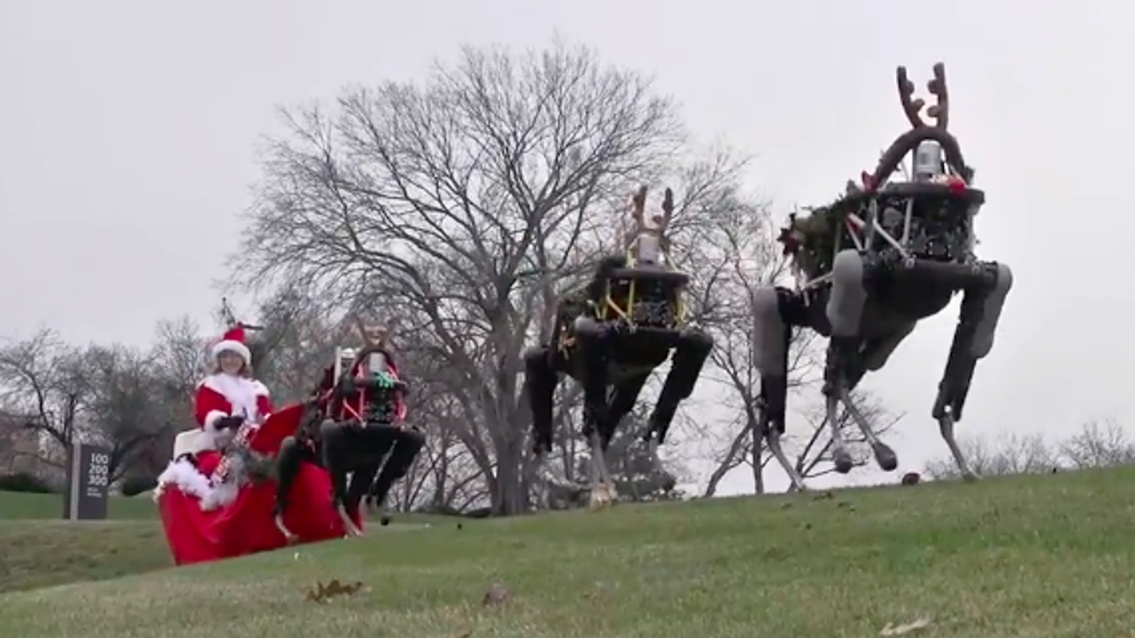 Недавно мы писали о том, что военные США начали испытания четырехногого робота Spot, который является более совершенной версией BigDog. Разработчики из Boston Dynamic не забывают о праздниках, в своем поздравлении они использовали трех роботов Spot, которые изобразили оленей, тянущих сани Санта-Клауса.