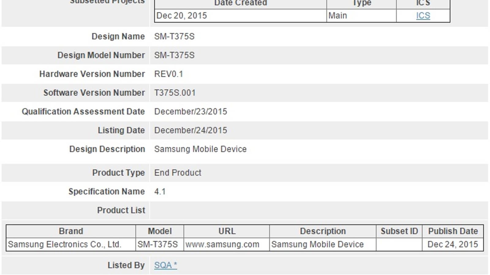 Новый планшет Samsung с индексом SM-T375S прошел сертификацию WiFi Alliance (WFA) и Bluetooth Special Interest Group (SIG) соответственно 16 и 24 декабря. Планшет соответствует требованиям спецификаций Wi-Fi 802.11n и Bluetooth 4.1.