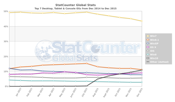 Так, например, по данным StatCounter, доля Windows 10 составляет 10,83%, при этом Windows 8.1 незначительно опережает ее с результатом 11,12%. Лидирует с большим отрывом (43,44%) Windows 7. На графике очень хорошо заметна тенденция, с которой Windows 10 рвется вперед. Вопрос только в том, когда пересекутся графики Windows 7 и Windows 10.