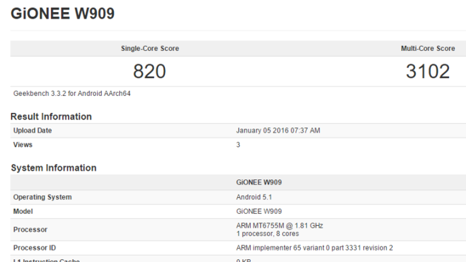 Оговариваемый смартфон Gionee прошёл тестирование в ПО Geekbench под именем W909. Приложение не позволяет оценить все параметры аппарата, но указывает также, что объём оперативной памяти равен 4 ГБ, то есть это будет смартфон достаточно высокого уровня либо и вовсе флагман. В качестве ОС выступит Android 5.1.