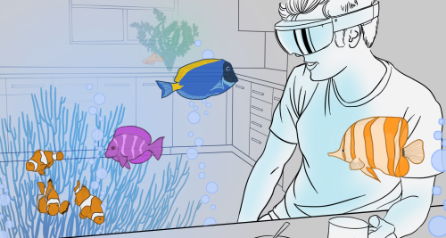 Первый, как можно догадаться, превращает окружающее пространство в аквариум. Точнее, как бы погружает пользователя в резервуар с водой и рыбками. По задумке авторов проекта, подводные обитатели должны реагировать на «присутствие» человека в их мире. Его движения могут распугать рыб. Кроме этого, подразумевается возможность кормить питомцев, чтобы привлечь их внимание.