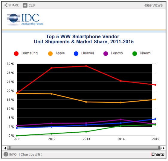 Говоря об усилении позиций, стоит выделить все три китайских бренда, которые в прошлом году улучшали свои показатели даже активнее, чем Apple. Но приз достается Huawei, которая в 2015 году поставила на рынок на 44,3% больше смартфонов, чем годом ранее.