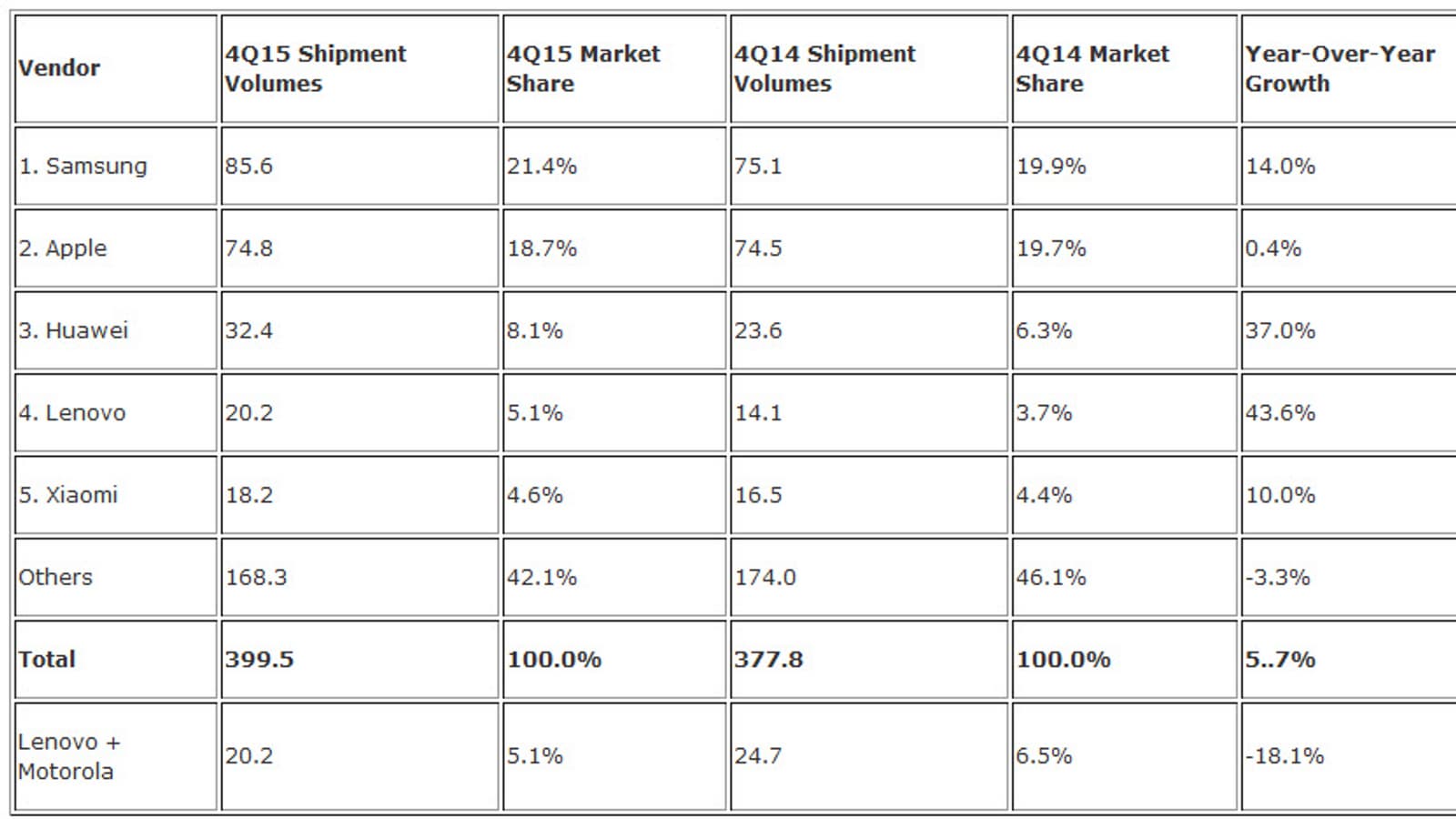 | Компания | Поставки в четвертом квартале 2015, млн шт. | Рыночная доля в четвертом квартале 2015 | Поставки в четвертом квартале 2014, млн шт. | Рыночная доля в четвертом квартале 2014 | Рост поставок |