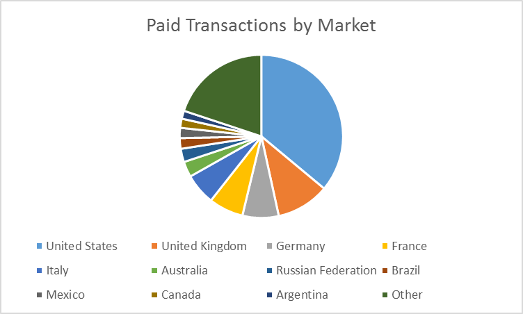 Если же говориться о платных транзакциях, то больше всего покупок в Windows Store совершают американцы (36%). На Соединенное Королевство, Францию и Германию суммарно приходится около 25%.