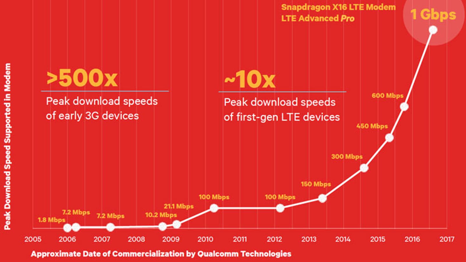 Snapdragon X16 LTE — первое изделие на новой архитектуре, разработанной специалистами Qualcomm. Сам производитель относит Snapdragon X16 LTE к шестому поколению модемов LTE. Как с каждым поколением увеличивалась скорость передачи данных, хорошо видно на графике, опубликованном компанией Qualcomm.