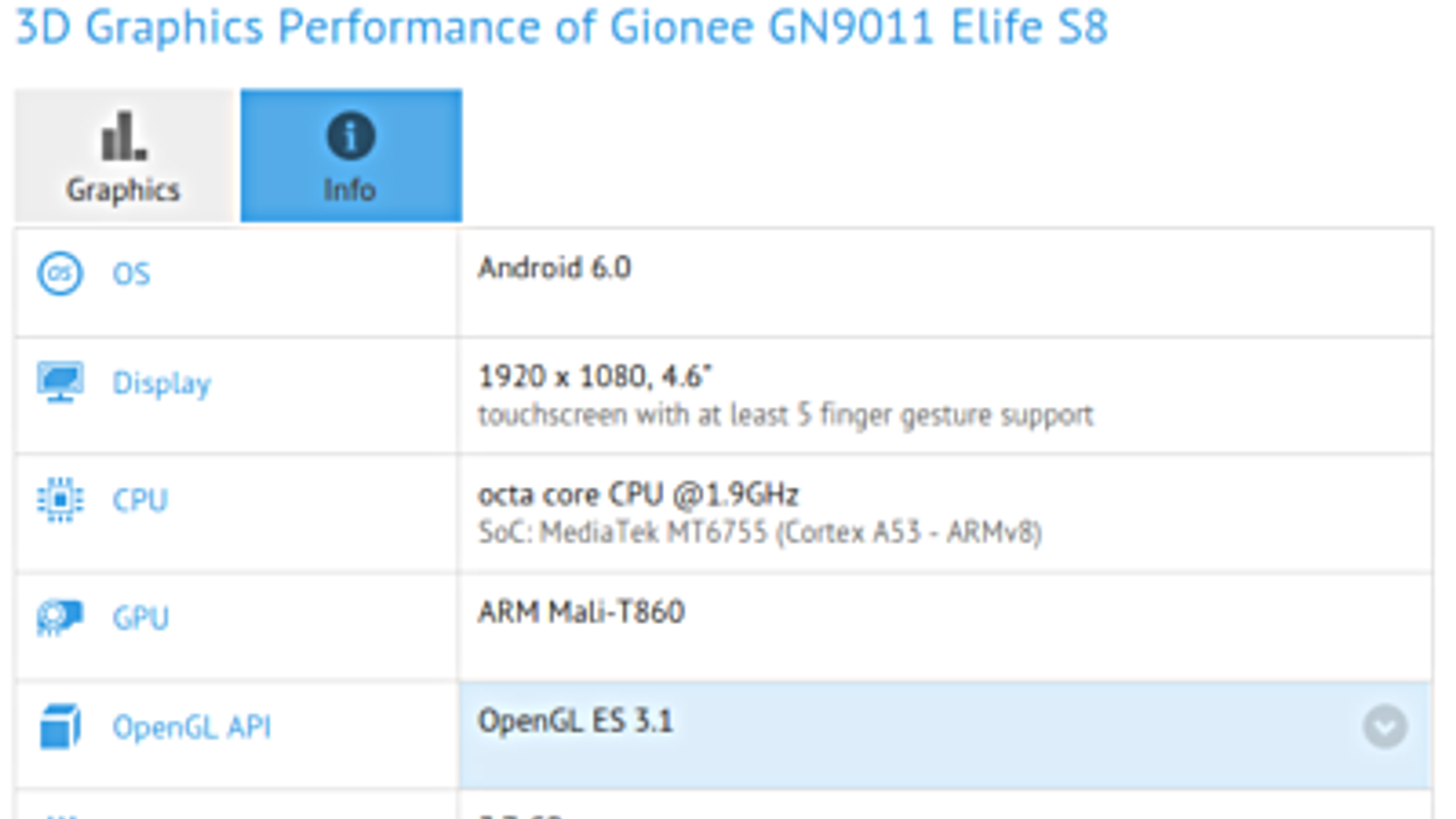 Если раньше мы просто подозревали, что речь идет о Gionee Elife S8, то после публикации следующей информации на сайте GFXBench, все сомнения испарились. Теперь мы также знаем, что дисплей будет иметь разрешение 1920 х 1080 пикселей, значение диагонали в GFXBench часто занижается, поэтому мы лишь предположим, что она составит 5 дюймов.