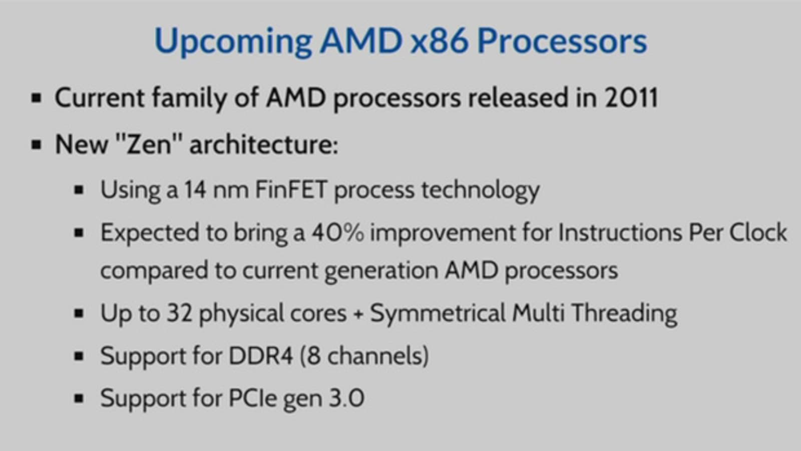 Однако в любом случае даже потребительские процессоры Zen существенно превзойдут своих предшественников по производительности в силу архитектурных отличий, включая симметричную или одновременную многопоточность (SMT). По оценке самой компании AMD, прирост составит 40%, если говорить о числе операций, выполняемых за машинный цикл. К другим достоинствам Zen относится поддержка DDR4 и PCI Express Gen 3.0.