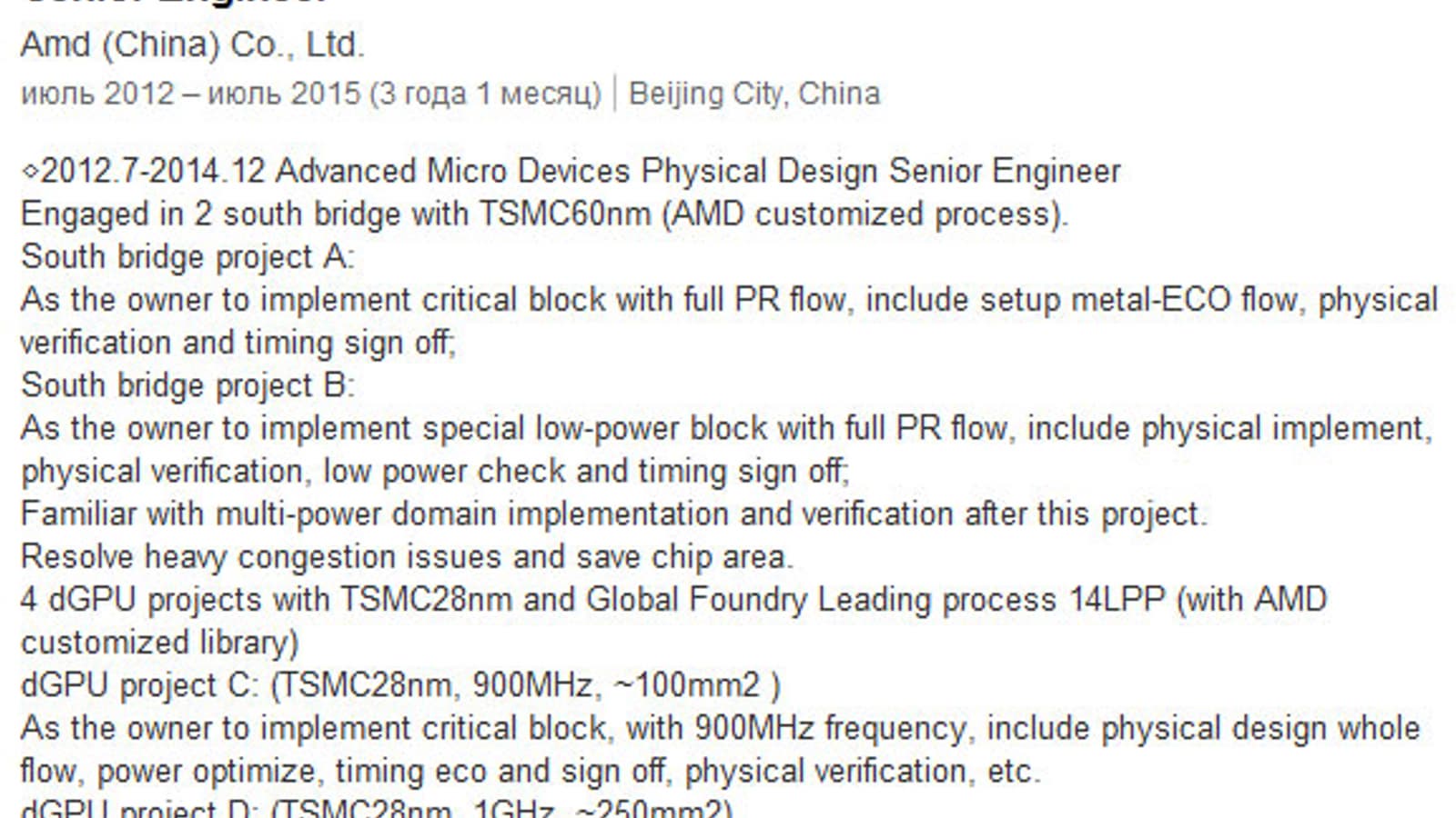Наши немецкие коллеги обнаружили в LinkedIn профиль проектировщика интегральных микросхем, который с июля 2012 по июль 2015 года работал в AMD, занимаясь разработкой наборов системной логики и GPU. Указанные им сведения содержат упоминание о некоем дискретном графическом процессоре, рассчитанном на изготовление по 14-нанометровой технологии.