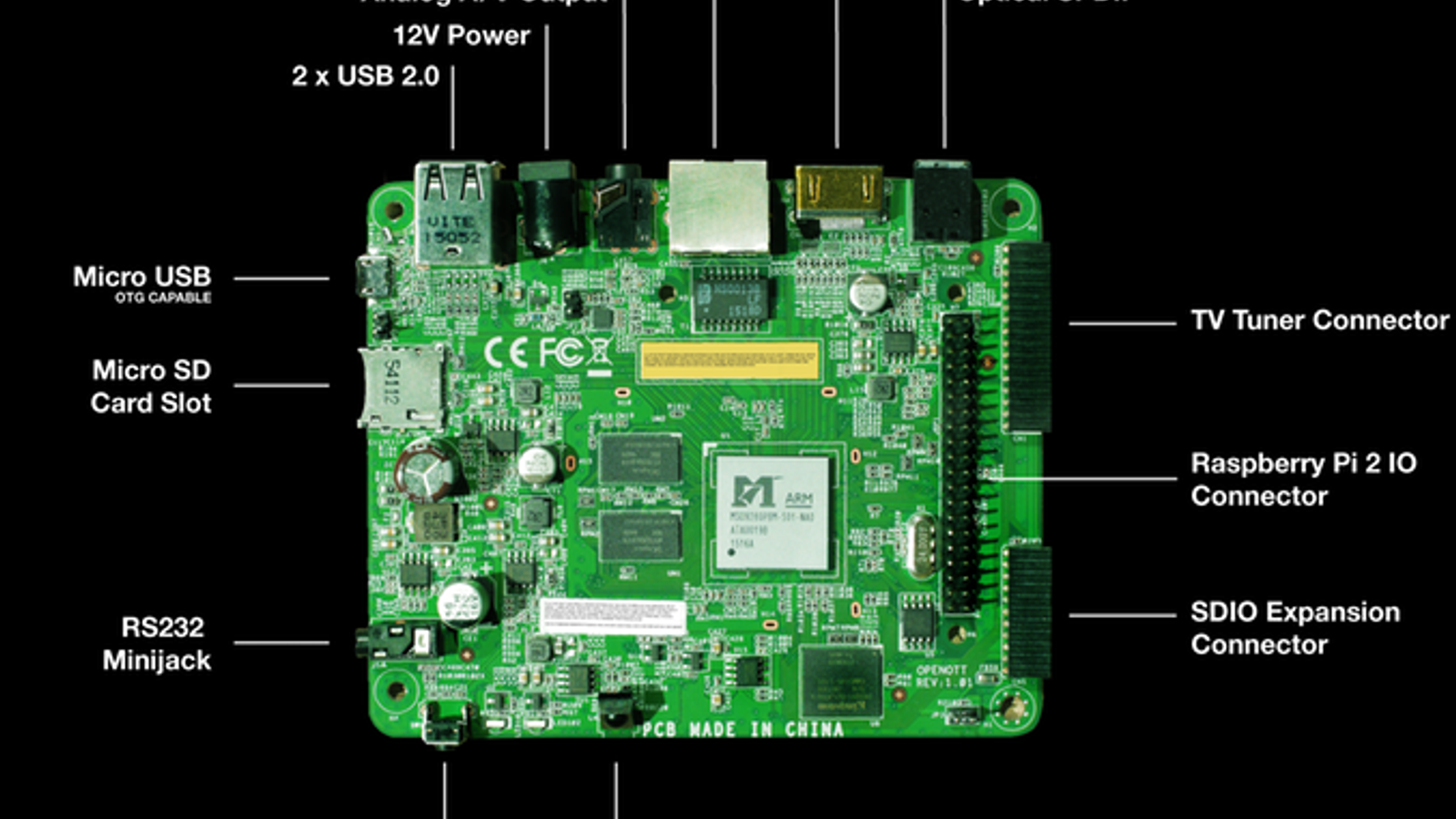 Есть 40 контактов GPIO, совместимых по выводам с Raspberry Pi, также есть контакты для подключения дочерней платы тюнера DVB-T2/C и интерфейс SDIO. В роли видеовыхода выступает HDMI 2.0 и аналоговый выход AV, имеется оптический аудиовыход S/PDIF и разъем mini-jack, совмещенный с RS-232. Уместным выглядит ИК-приемник, два порта USB 2.0 и один microUSB с поддержкой OTG. Для подключения к локальной сети есть порт Fast Ethernet, питание подается от адаптера с выходным напряжением 12 В. Компания Futarque проводит кампанию по сбору средств на выпуск Rho Board, минимальный взнос, дающий возможность обладания устройством, составляет $35.
