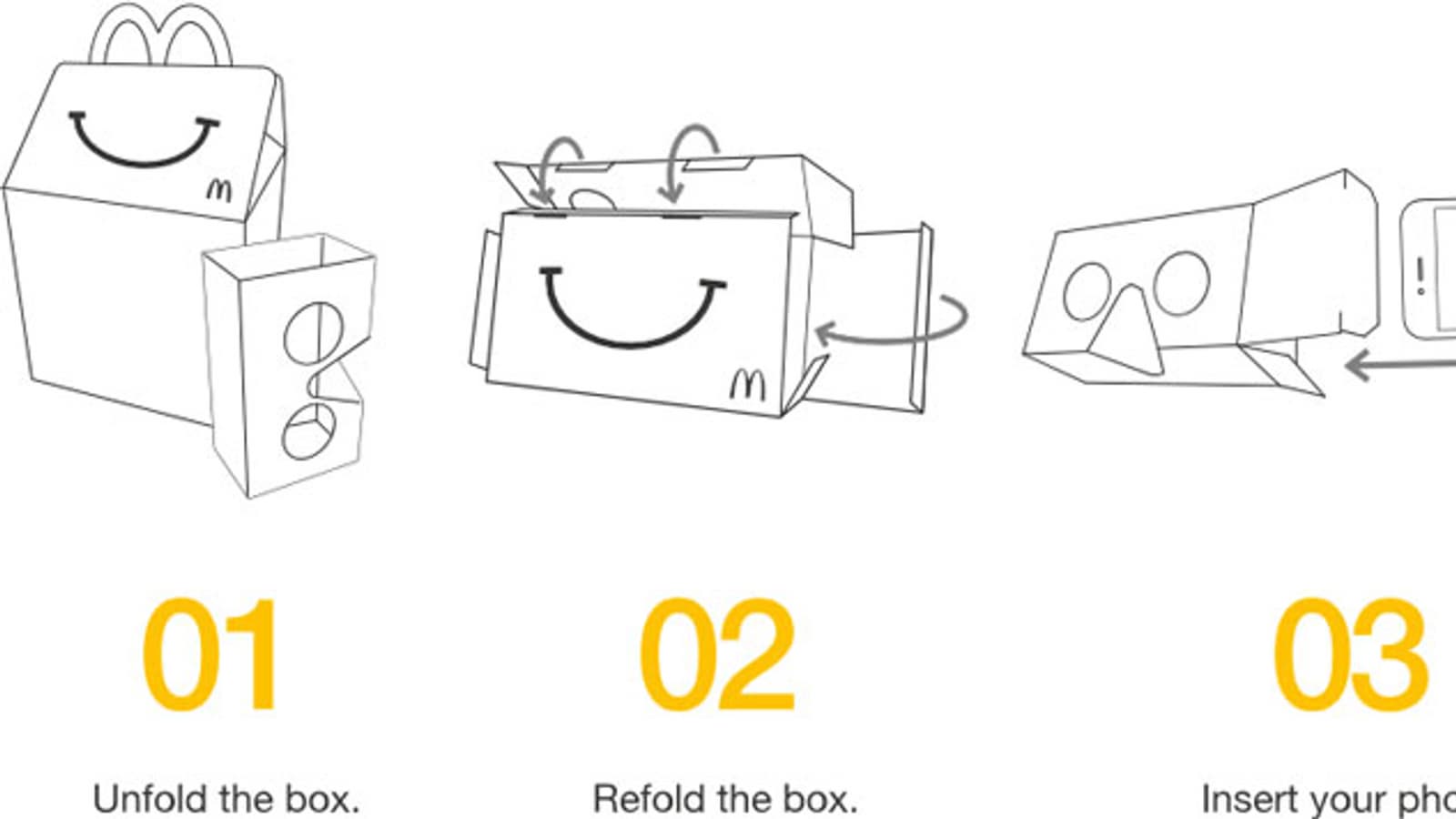Посетители ресторанов быстрого питания McDonald's в Швеции скоро будут получать наборы Happy Meals в не совсем обычной упаковке. Картонная коробка скроена таким образом, что ее можно легко переделать в гарнитуру виртуальной реальности, если следовать инструкции.