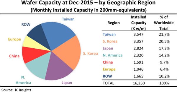 Аналитики IC Insights подсчитали производственные возможности компаний, выпускающих полупроводниковую продукцию, и пришли к выводу, что мировым лидером по суммарной производительности полупроводниковых фабрик по состоянию на декабрь 2015 года является Тайвань. В стране сосредоточено почти 21,7% общемирового производства микросхем и других полупроводниковых изделий.