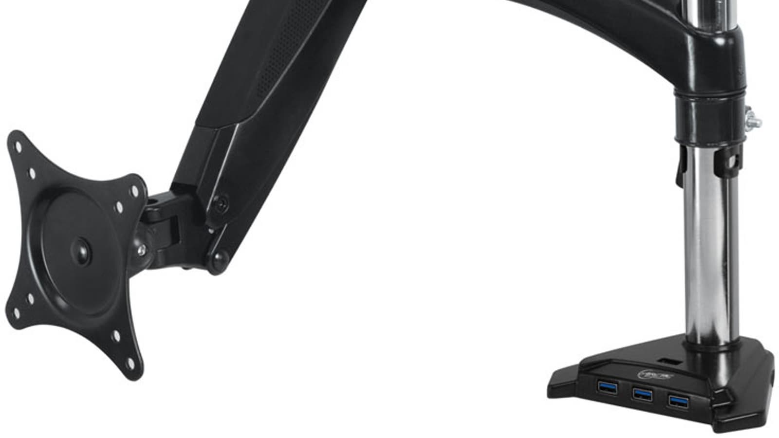 С помощью струбцины Arctic Z1-3D крепится к краю стола, а просверлив сквозное отверстие, крепление можно установить в любой точке. Допустимая толщина столешницы — 65 мм. В основании опоры находится четырехпортовый концентратор USB 3.0, работающий от собственного источника питания.