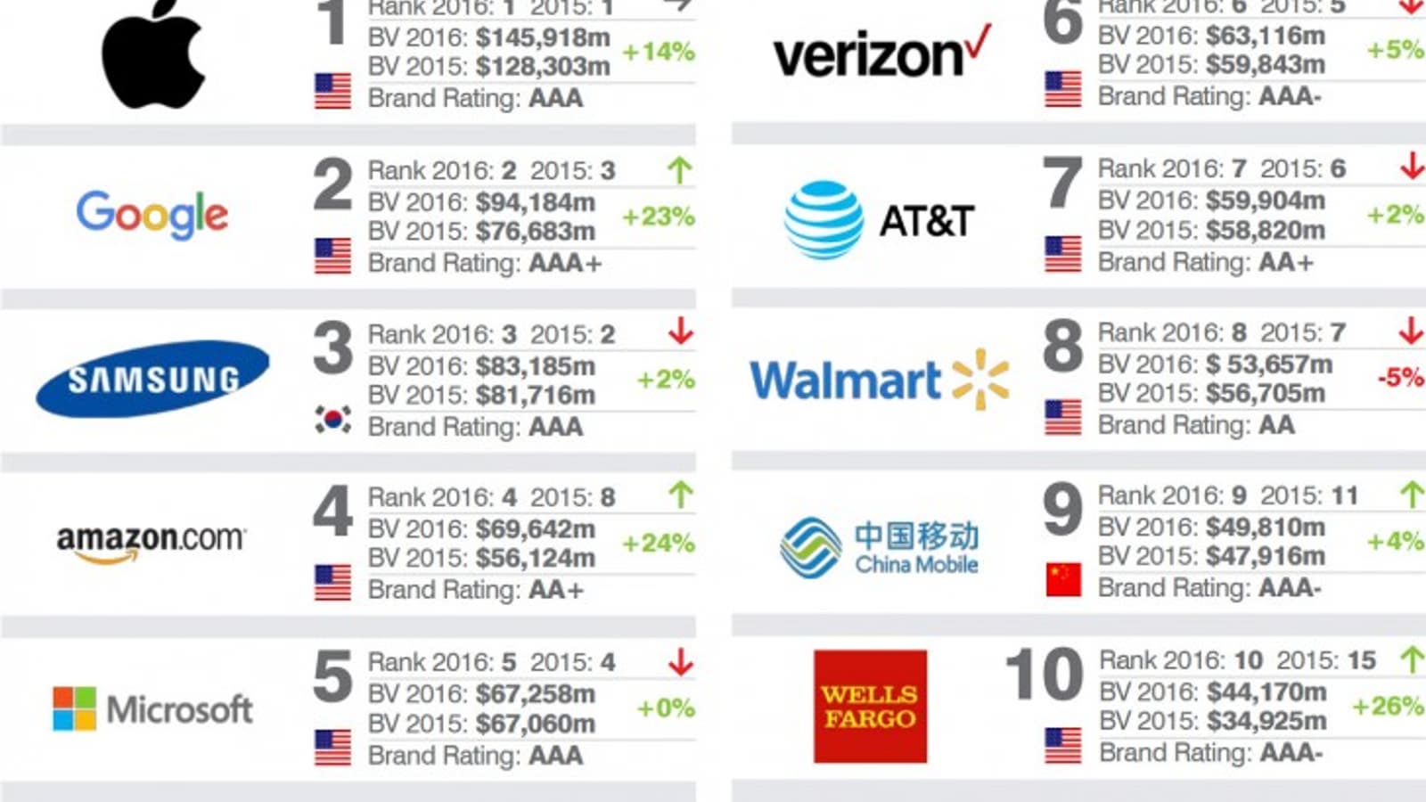С третьего на второе место за год перебралась Google. Бренд оценивается в 94,2 млрд долларов. За год стоимость марки выросла на 23%. Замыкает тройку лидеров Samsung, с которой поисковый гигант и поменялся местами. Корейский лидер оценивается в 83,2 млрд долларов, а годовой прирост составил лишь 2%.
